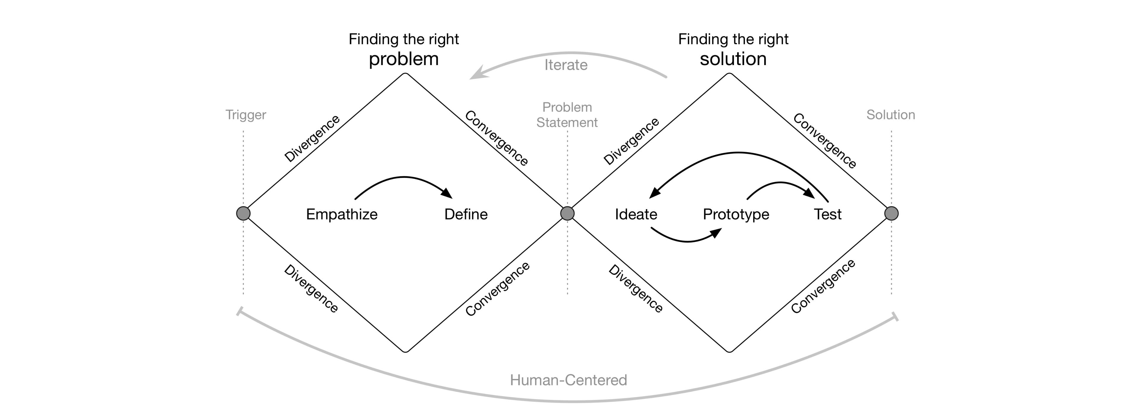 Design thinking is a non-linear, iterative process that teams use to understand users, challenge assumptions, redefine problems and create innovative solutions to prototype and test.